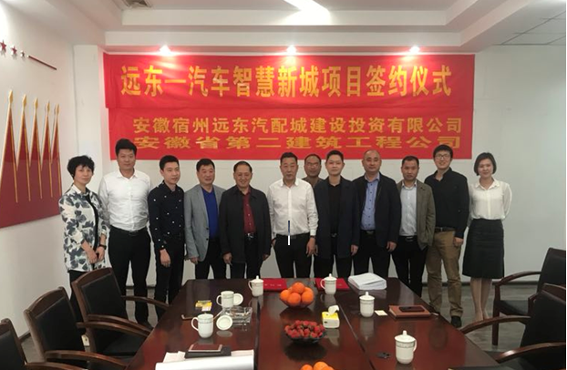 4月18日下午,安徽宿州遠東汽配城建設投資有限公司與安徽二建公司就 “遠東汽車智慧新城”項目在宿州舉行簽約儀式。安徽宿州遠東汽配城建設投資有限公司董事長朱成野、執(zhí)行董事徐子平、總經(jīng)理鄭志強,公司副總經(jīng)理葉和永、安裝公司副經(jīng)理朱楊杰,以及相關人員等出席簽約儀式。
