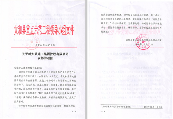經(jīng)過兩年的“浴血奮戰(zhàn)”,2018年9月30日,太和PPP項目完成交工驗收工作,項目建設(shè)圓滿收官,并受到太和縣人民政府及太和縣重點示范工程領(lǐng)導(dǎo)小組辦公室的一致表彰,為公司品牌宣傳,形象提升做出積極努力,為“打造一流安徽建工”添磚加瓦。