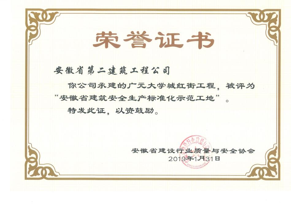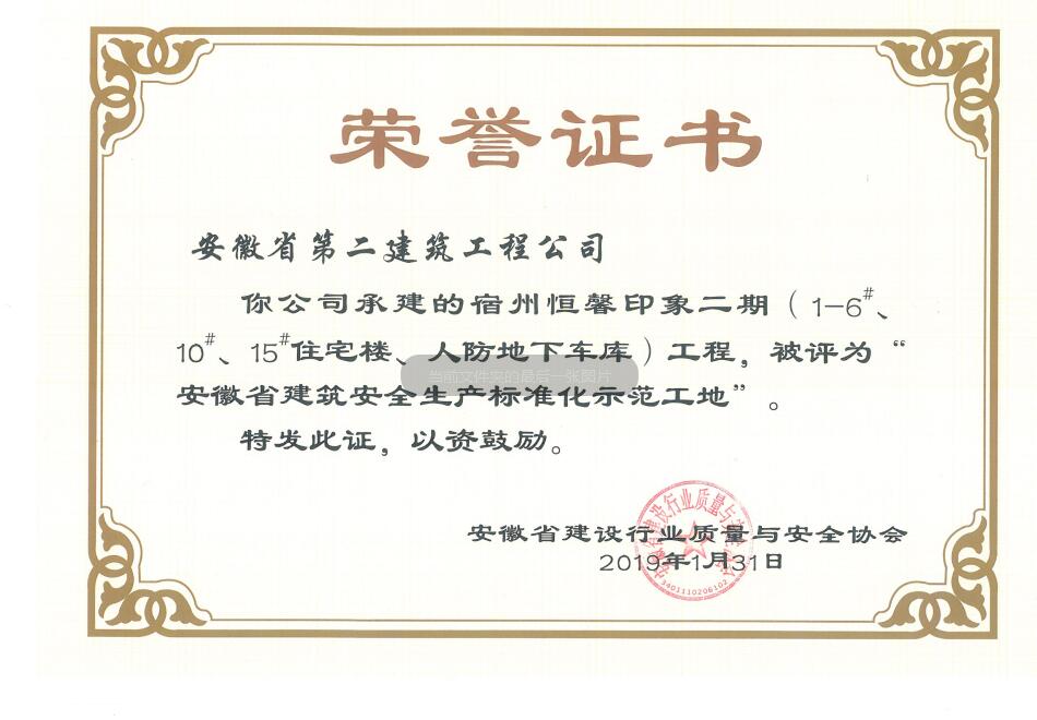 近日,從安徽省建設(shè)行業(yè)質(zhì)量與安全協(xié)會獲悉,安徽二建承建的肥西涼亭雅苑、阜陽楓林源筑、阜陽廣元大學城、宿州恒馨印象、淮北東岳雅苑5個項目獲得2018年度“安徽省建筑施工安全生產(chǎn)標準化示范工地”稱號,為公司再添榮譽。